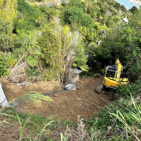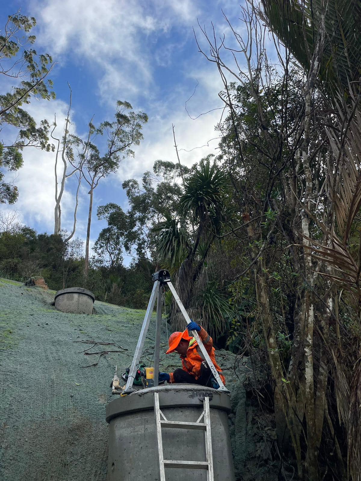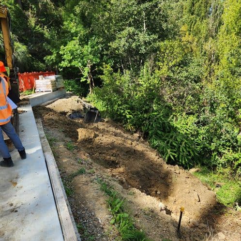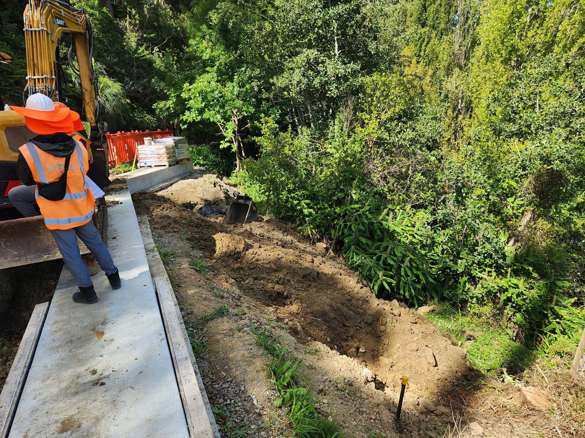 - The site was extremely constrained: steep slopes, limited working width, minimal allowance for staging or spoil storage, and adjacent vegetation/native bush to protect.