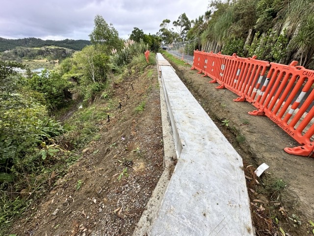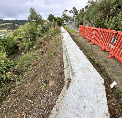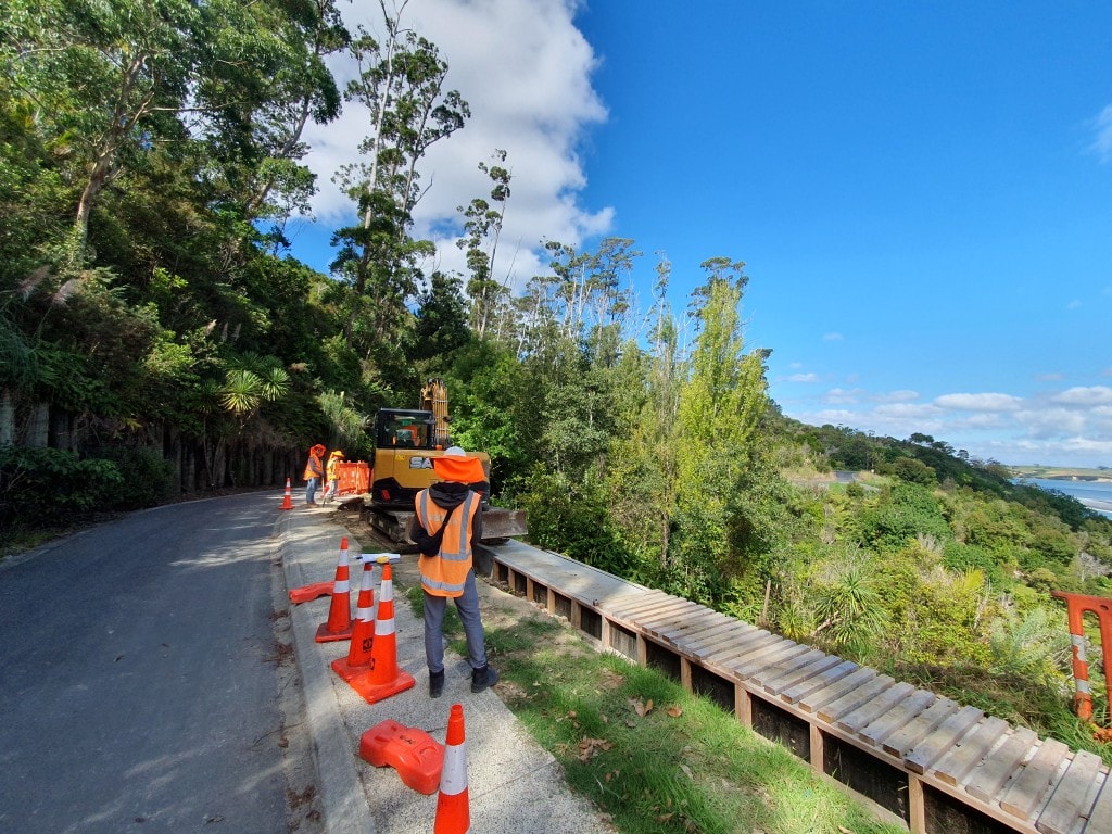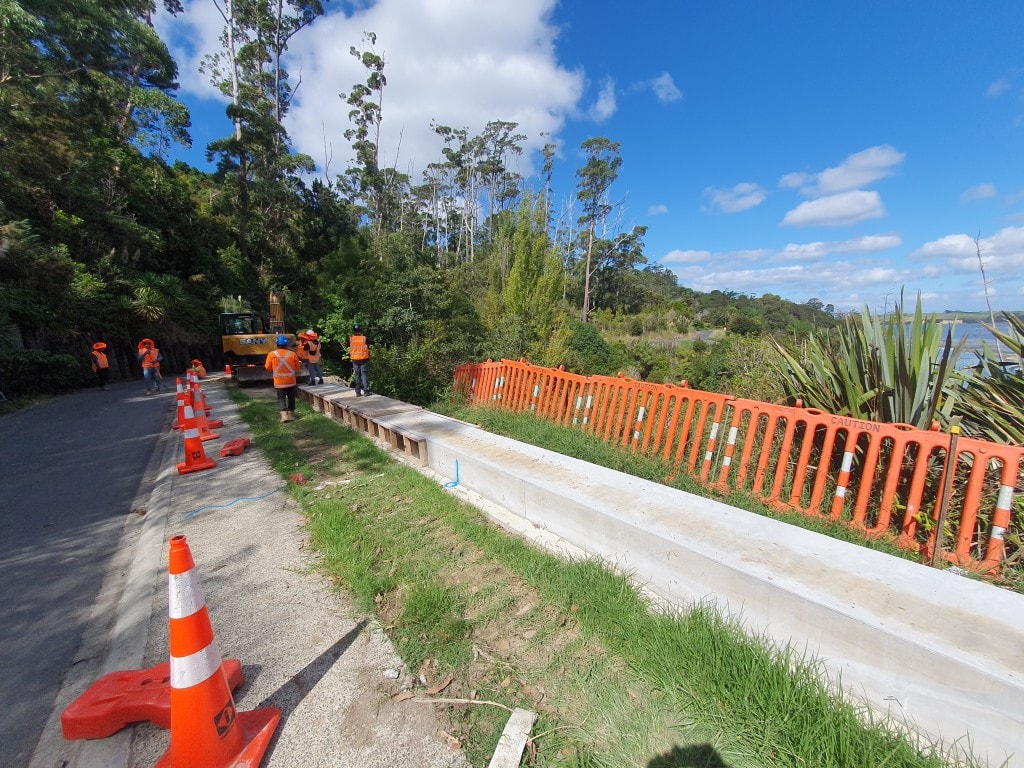 Slip remediation and slope stabilisation for 48 Riverhaven, Whangaparāoa - drainage, retaining, and civil works under constrained steep terrain, subcontracting for Fulton Hogan with zero incidents.